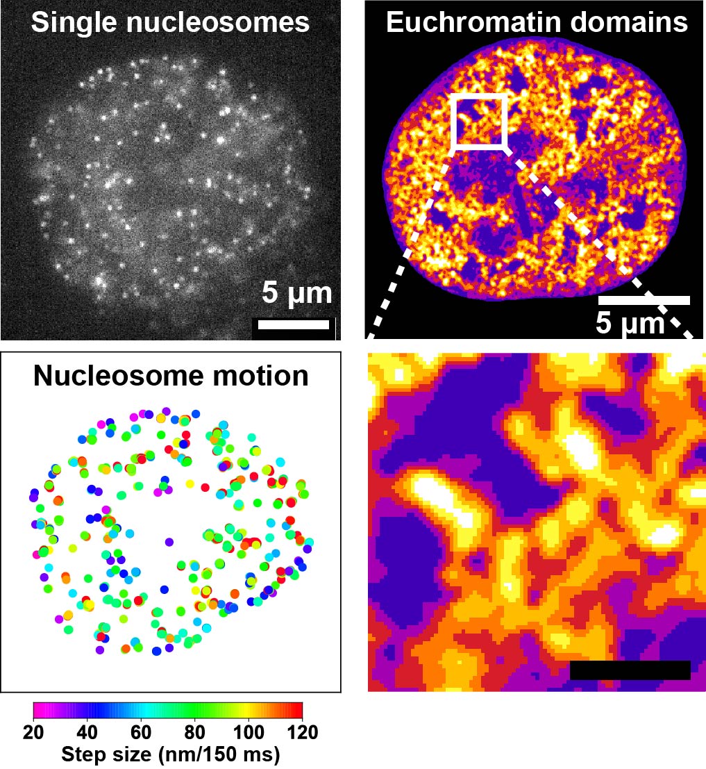 さらに、生きた細胞のユークロマチン・ヘテロクロマチンドメインと、クロマチンドメインの内部や外部のヌクレオソーム、タンパク質分子の動きの軌跡を、構造化照明と一分子顕微鏡