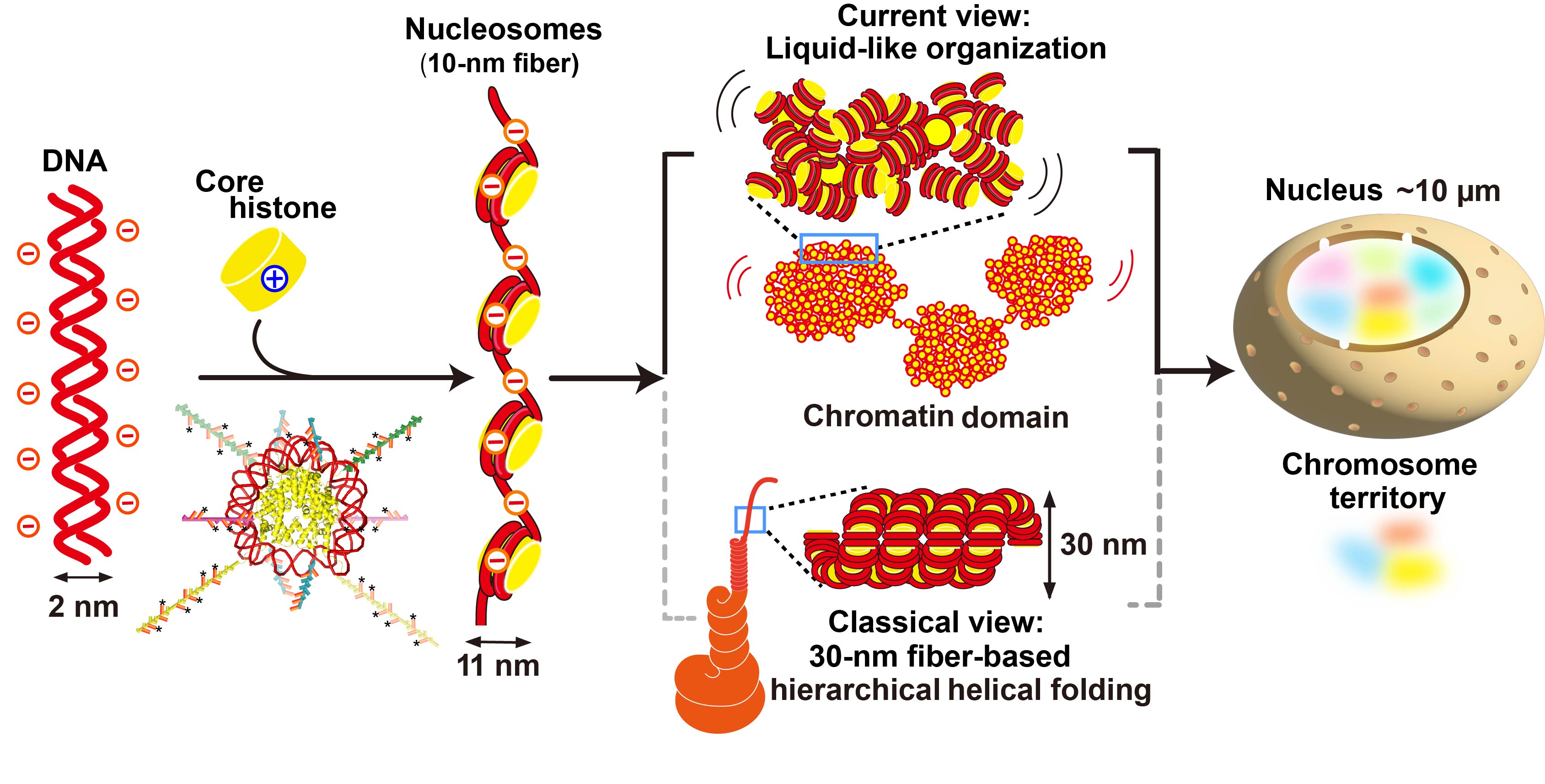 従来の説では、ヌクレオソームは規則正しく配置されて直径30 nmの線維をつくり、さらにらせん状に折り畳まれて階層構造を形成するとされていました