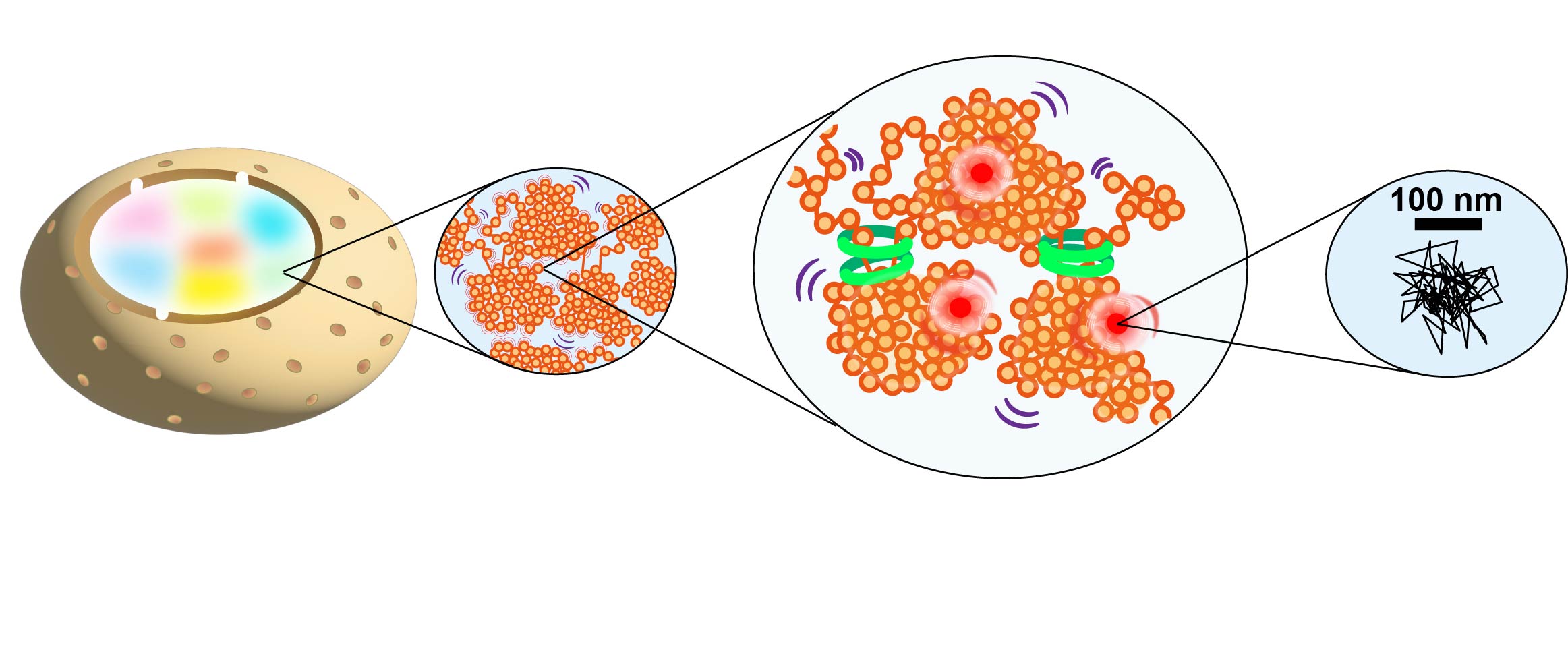 (図2左、動画)、短い時間においては液体のように振る舞うことが判明しています (Iida et al., Science Adv 2022; Nozaki et al., Science Adv 2023)。また、超解像顕微鏡により、細胞内のヌクレオソームの分布を高解像度で観察することで、これらが直径200 nm程度のクロマチンドメインという塊を形成することも示してきました(図2右)(Nozaki